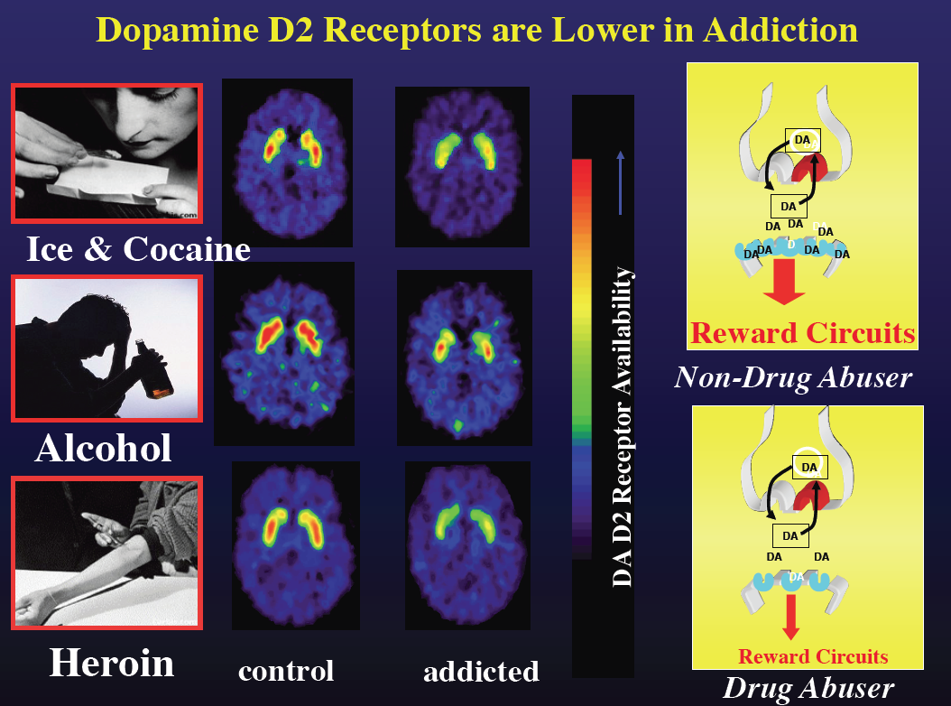 The patchy, reduced blood flow shown above in heroin addiction seems to be present in all addictions, including alcohol and speed.