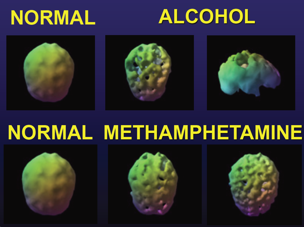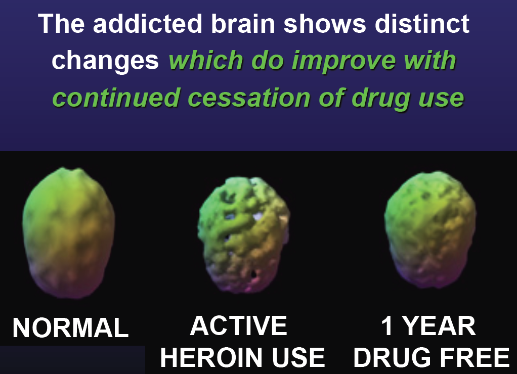 The addicted brain (regardless of the addiction - can be alcohol, heroin, methamphetamine, cocaine, even gambling) is biologically different and takes time to heal. This is why rapid detox programs often fail. See the pictures below (kindly supplied by Professor Jon Currie, neurologist).
